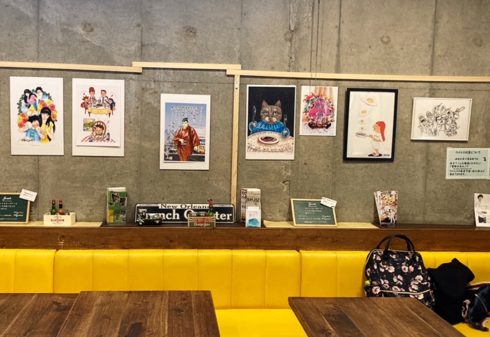 また、駅の東口や西口のグルメなお店には「ビッグ錠の仲間たち」のイラストが展示され、作品を眺めながら飲食を楽しめるイベントや、カフェバーでは「ビッグ錠×川崎のぼる作品展」も開催され、湘南台の街を彩っていた。