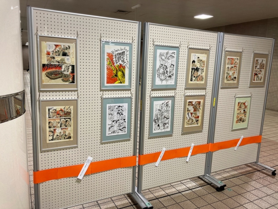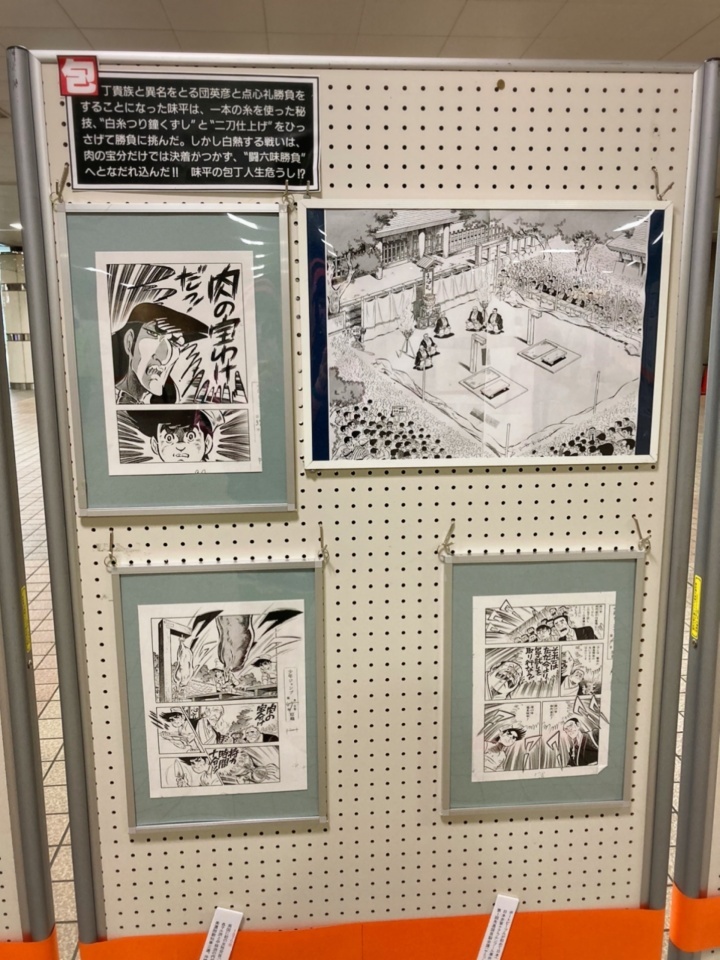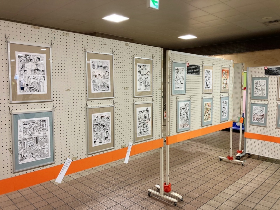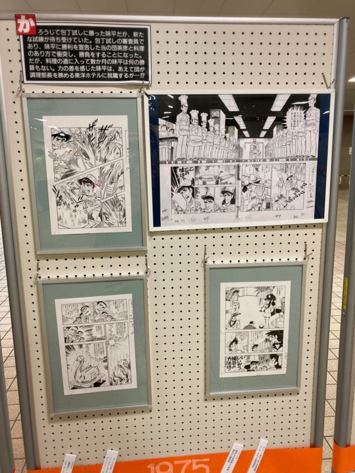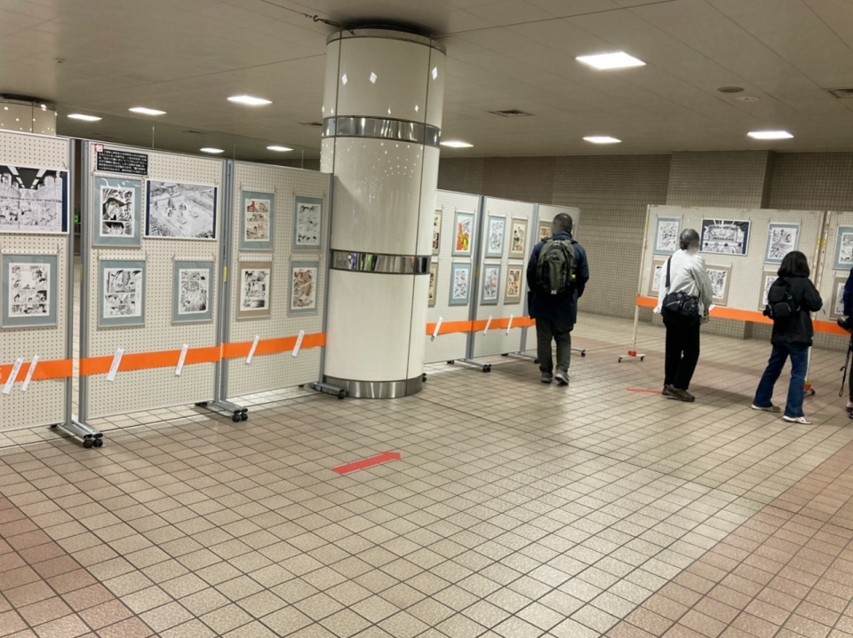湘南台駅地下広場に「包丁人味平」のイラストや漫画原稿が展示され、コロナ対策をした上でお客様が作品を楽しんでいた。