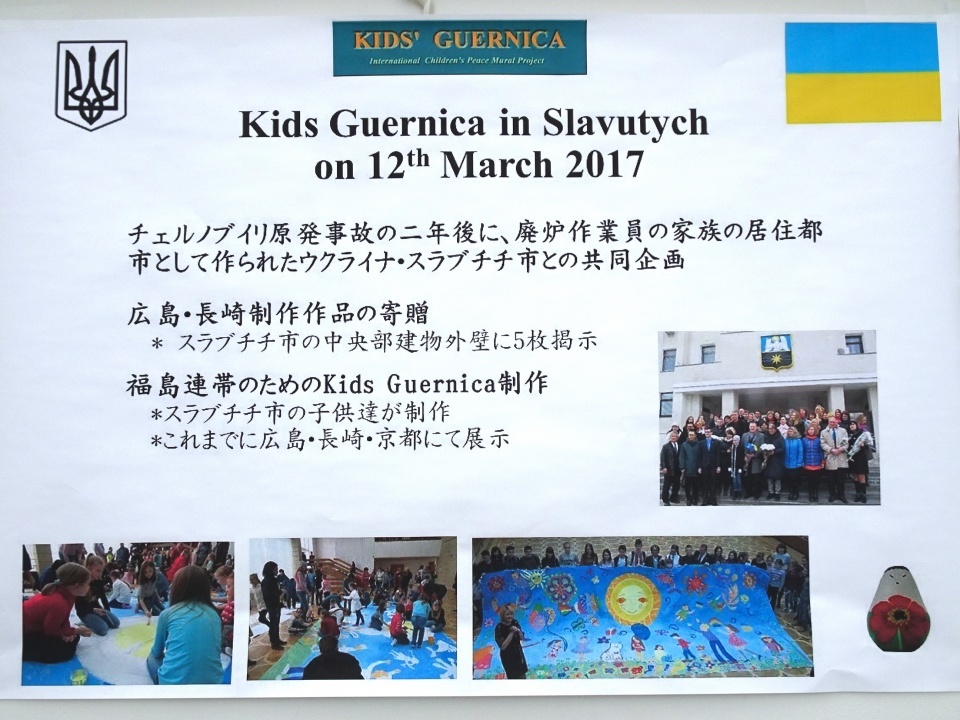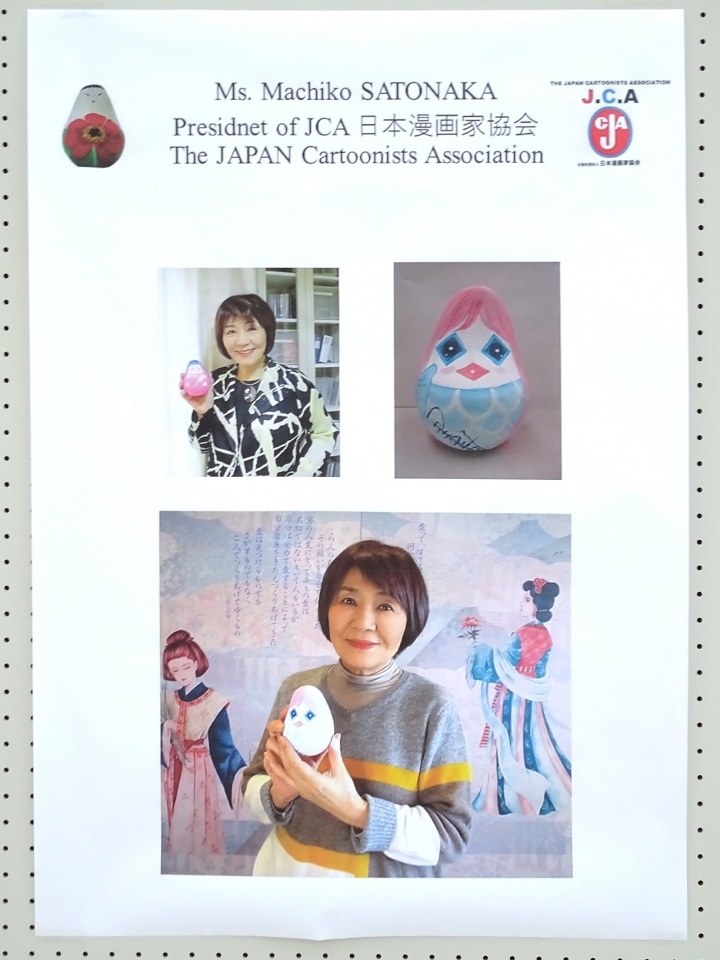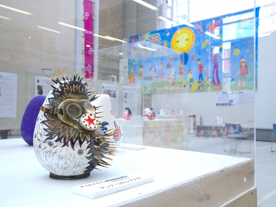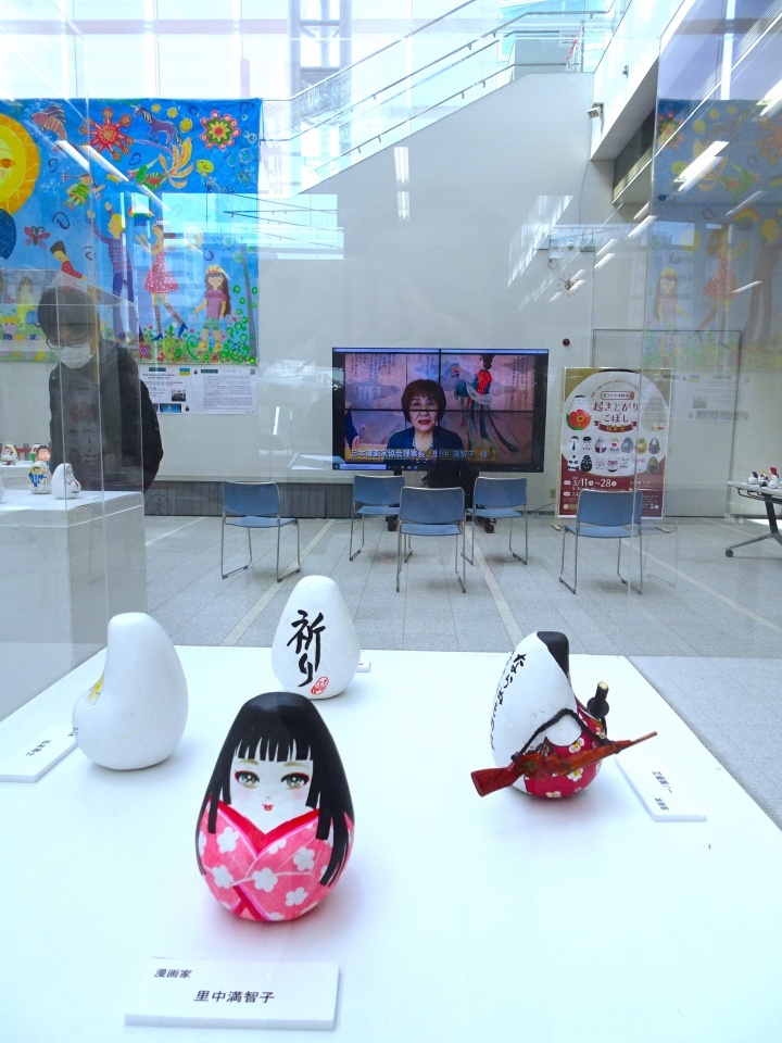 フランスで始まった「起き上がりこぼしプロジェクト」は一会場では展示しきれないほど点数が増え、近年は会場に合わせたチョイスでの展示が主になっています。「こむこむ」は、プラネタリウムと図書館、体験学習ができる様々な部屋がある子供向け教育文化施設なので、当協会員による「まんがこぼし」と、同時期に開催されるウクライナ・スラブチチからの作品中心の展示となりました。そのほかデザイナーやスポーツ選手俳優など各界著名人、広島・長崎・京都各市長の作品など合わせてこぼし258体、ウクライナの子供達による素晴らしい大作「キッズゲルニカ」も来場しました。会場は建物入ってすぐの広場で、当協会会長ちばてつや氏、理事長里中満智子氏ほかのビデオメッセージも流されています。