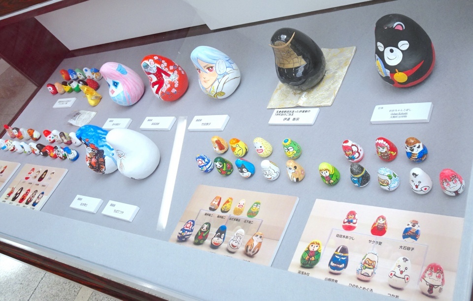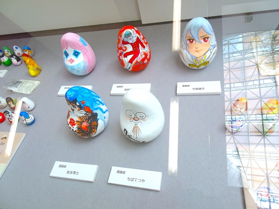 「まんがこぼし」には新しく「コロナ禍からの起き上がりこぼし」が追加されました。一人で訪れる熱心な漫画ファンが多く、皆さん時間をかけてじっくり見ていかれるそうです。展示方法は各会場いろいろですが、こぼし全体に絵をつけた作品が多いので、背面も見られる展示は製作した側としても嬉しいものです。コロナ禍ではありますが、対策を十分にとり、最初の土日の来場者は600人を超えたとの事です。起き上がりこぼしは、何度ひっくり返されても起き上がります。作品に触れることはできませんが、各作品の強く起き上がる精神が見る方の励ましになればと願います。